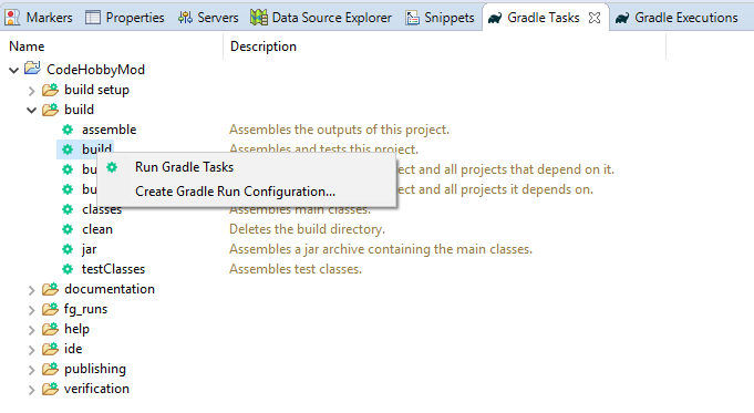 In order to build the mod into a jar file, go to the ‘Gradle Tasks’ view, right click ‘build’ and select ‘Run Gradle Tasks’.